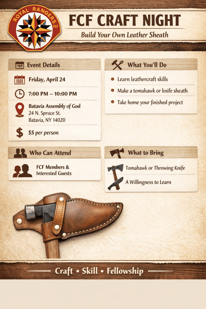 Open to all who are already in or interested in joining FCF. Come out and make a sheath for your Hawk or Knife. $5:00 Donation