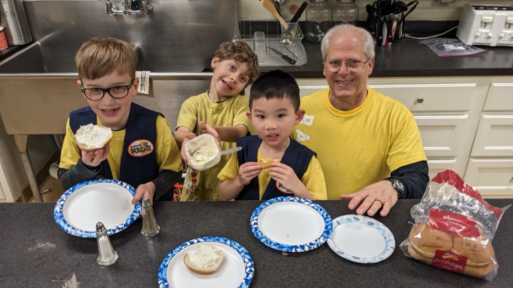The boys were working on their Choosing Kindness Achievement patch and making a meal of kindness. They started with heavy cream, shook it, and turned it to make butter. It was so good that the boys had three rolls with butter. That sounds great!