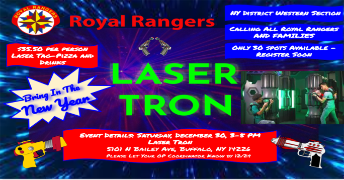 The Royal Rangers Family New Year Event is set. This year, we will be going to Laser Tron in Buffalo. You won't want to miss this if you haven't tried Laser Tron lately - or ever. They now have a new gameplay and offer four styles of gameplay. Check out the link here and bring the whole … Continue reading Laser Tron New Year Celebration